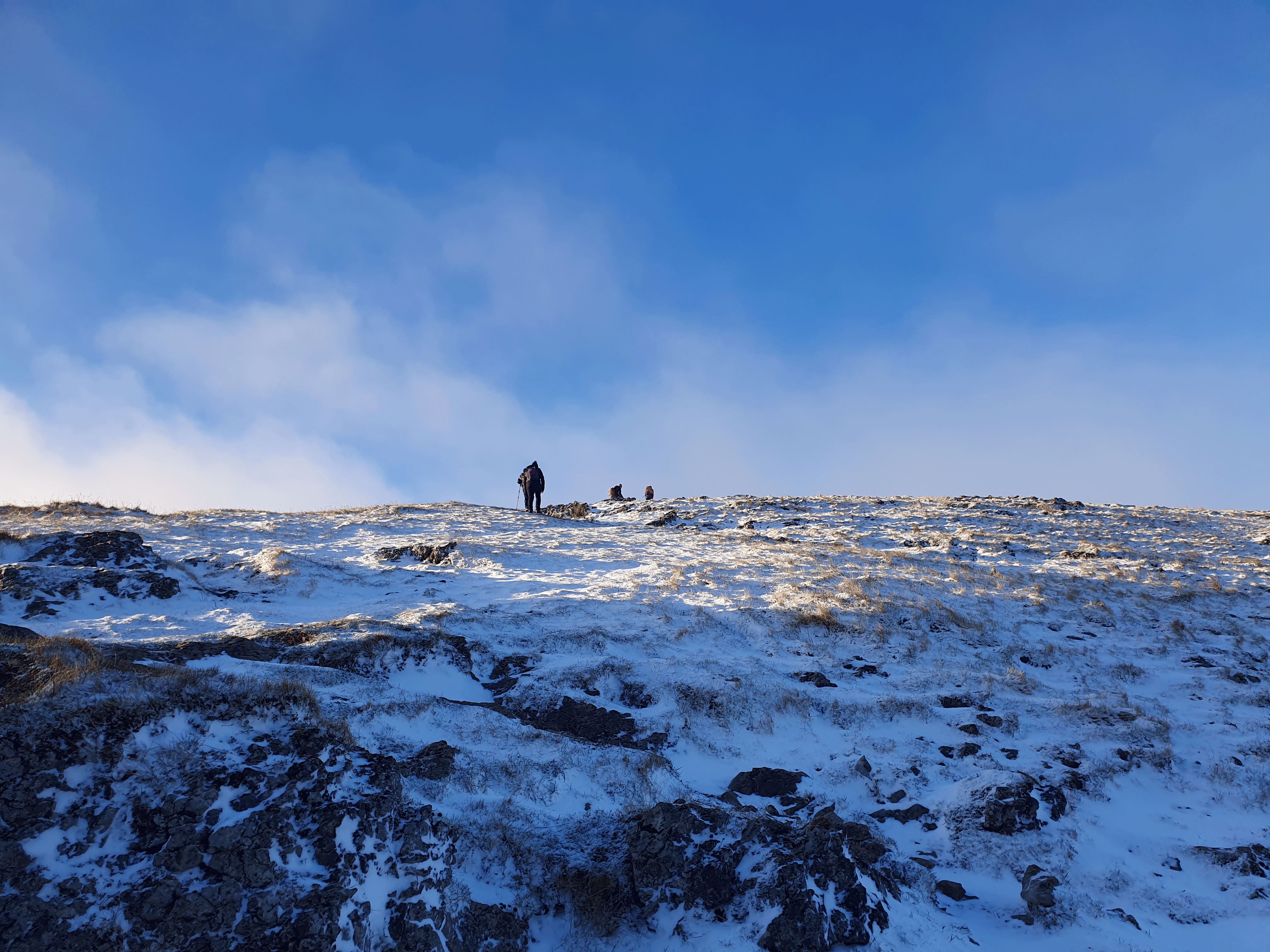 Once we parked up, we met the other hikers (of which there were 13) and the two guides, David and Jimmy, and after a few introductions, we set off. We initially walk up the tarmac road and then start to cross the bog towards the mountain. Even in frozen conditions the bog was, well, boggy. This is Ireland. Expect bog. Wear decent hiking boots. The landscape is somewhat soggy and fascinating, and we hopped across babbling streams as sheep jumped out of our way (alas, no dogs are allowed on this hike and so we had left ours in his favourite kennels for the day).