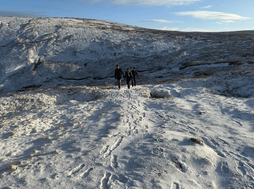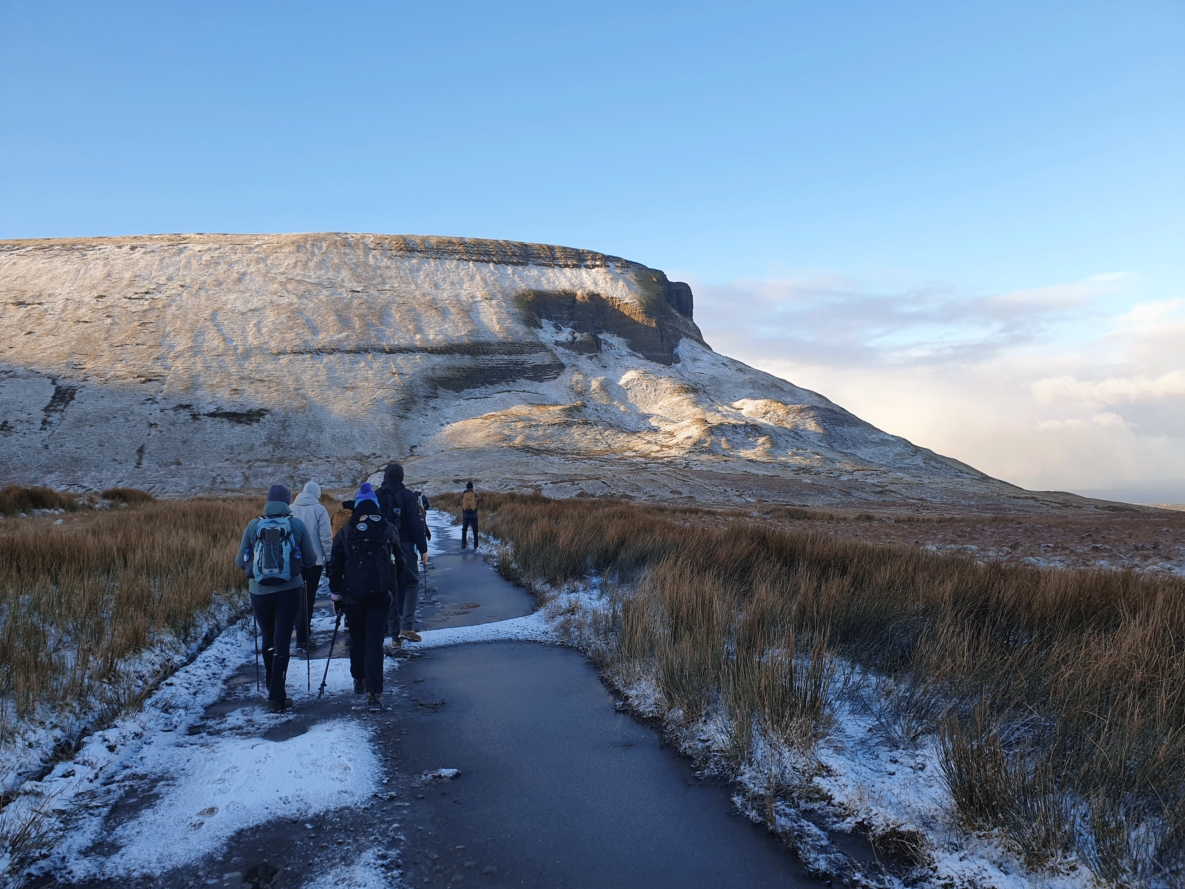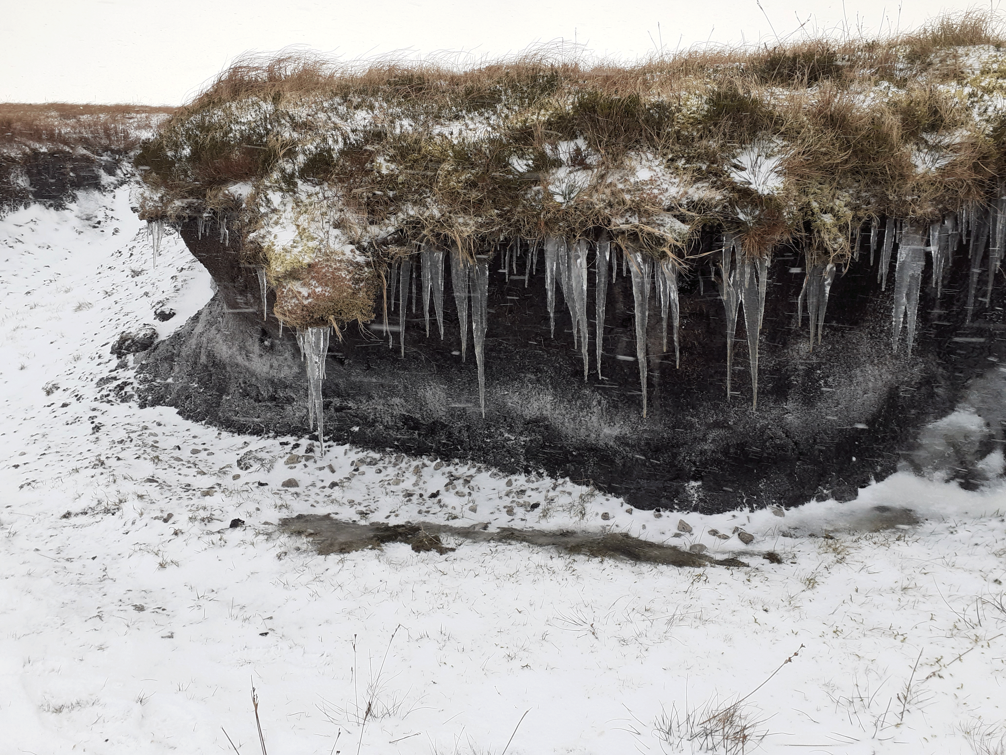 After a while we started the return leg, a slightly different route along the edge of the North face of the mountain where its steep craggy sided edges drop precipitously downwards. We passed peat outcrops where long icicles had appeared in the freezing conditions. The one-meter depth of peat that sat atop the limestone had taken 1000 years to form, approximately 1mm per year.