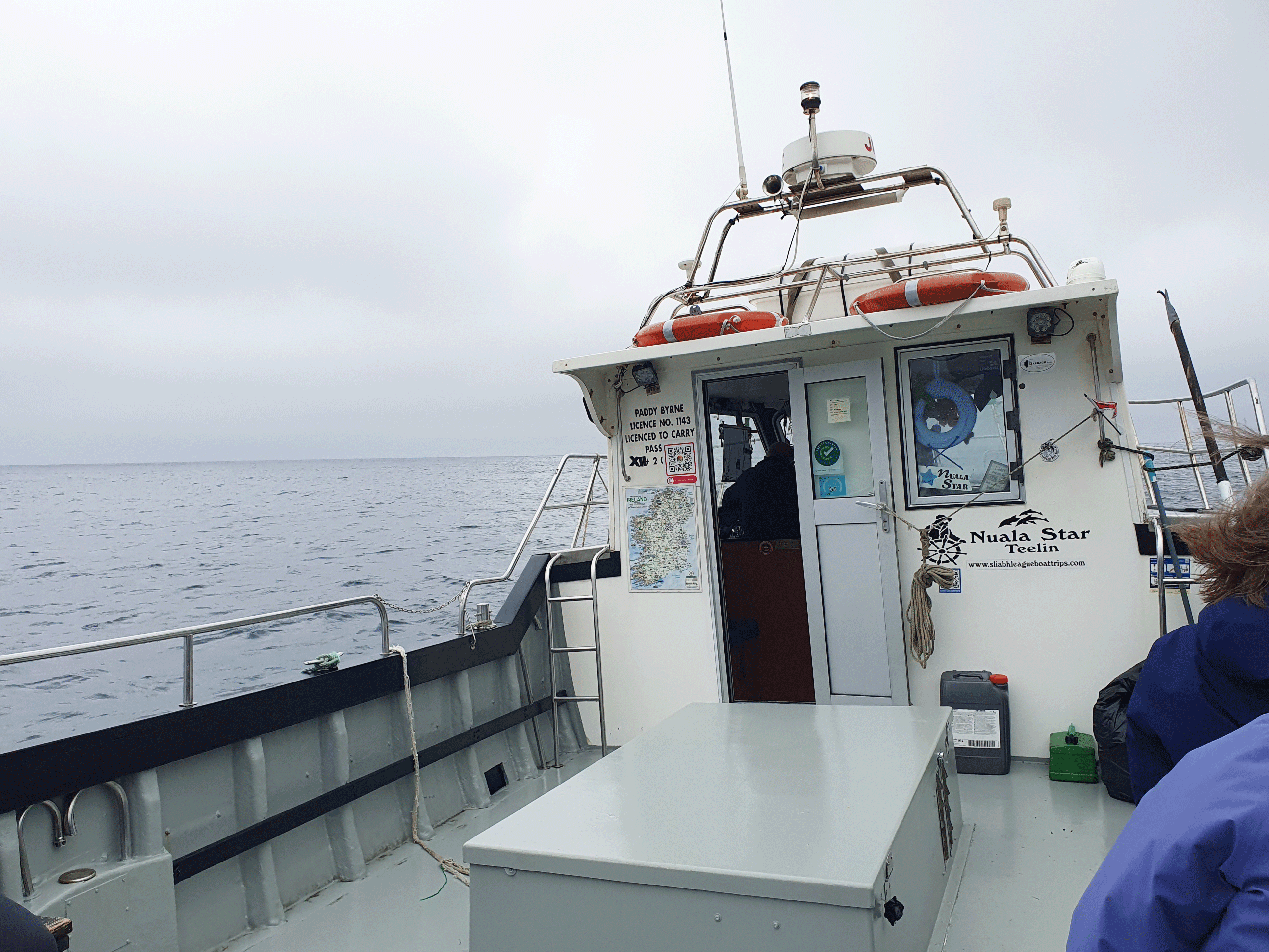 Replenished with hearty soup and chowder, we drove down to Teelin Pier and parked up. We had already booked our 2 hour boat trip with Sliabh Liag Boat Trips via their website, and we chatted to Donal at the kiosk whilst waiting for the previous boat trip to return. The boat trip company has been running many years and they offer sightseeing tours, private trips, and evening angling trips. Right on time the Nuala Star with Paddy at the helm came chugging round the harbour wall full of happy passengers. We noticed that some of the passengers were clutching towels. They had been swimming. In the sea. In the cold wet rain. Brave souls, braver than me! There is the option to swim from the boat if you want to. I did not.