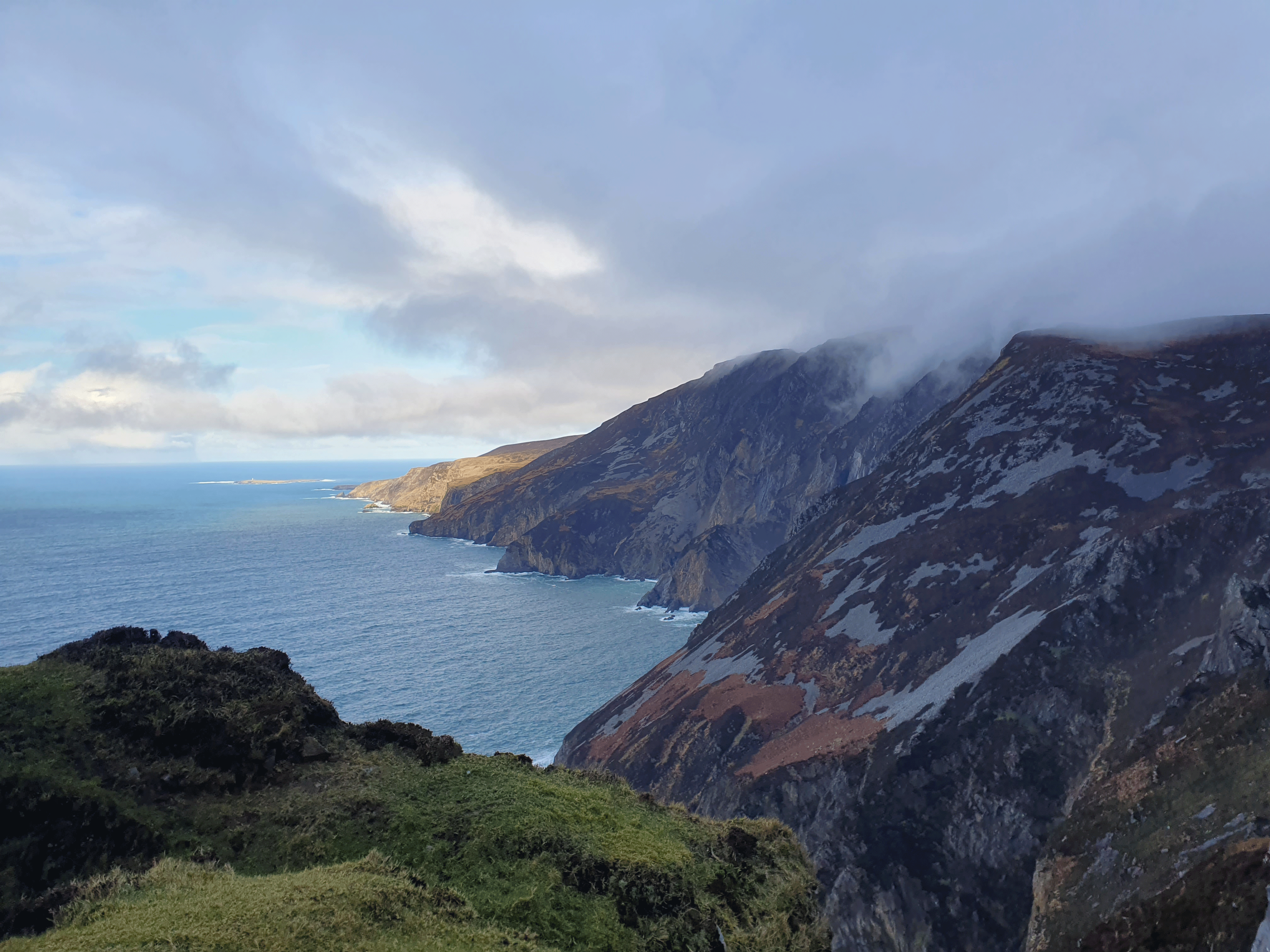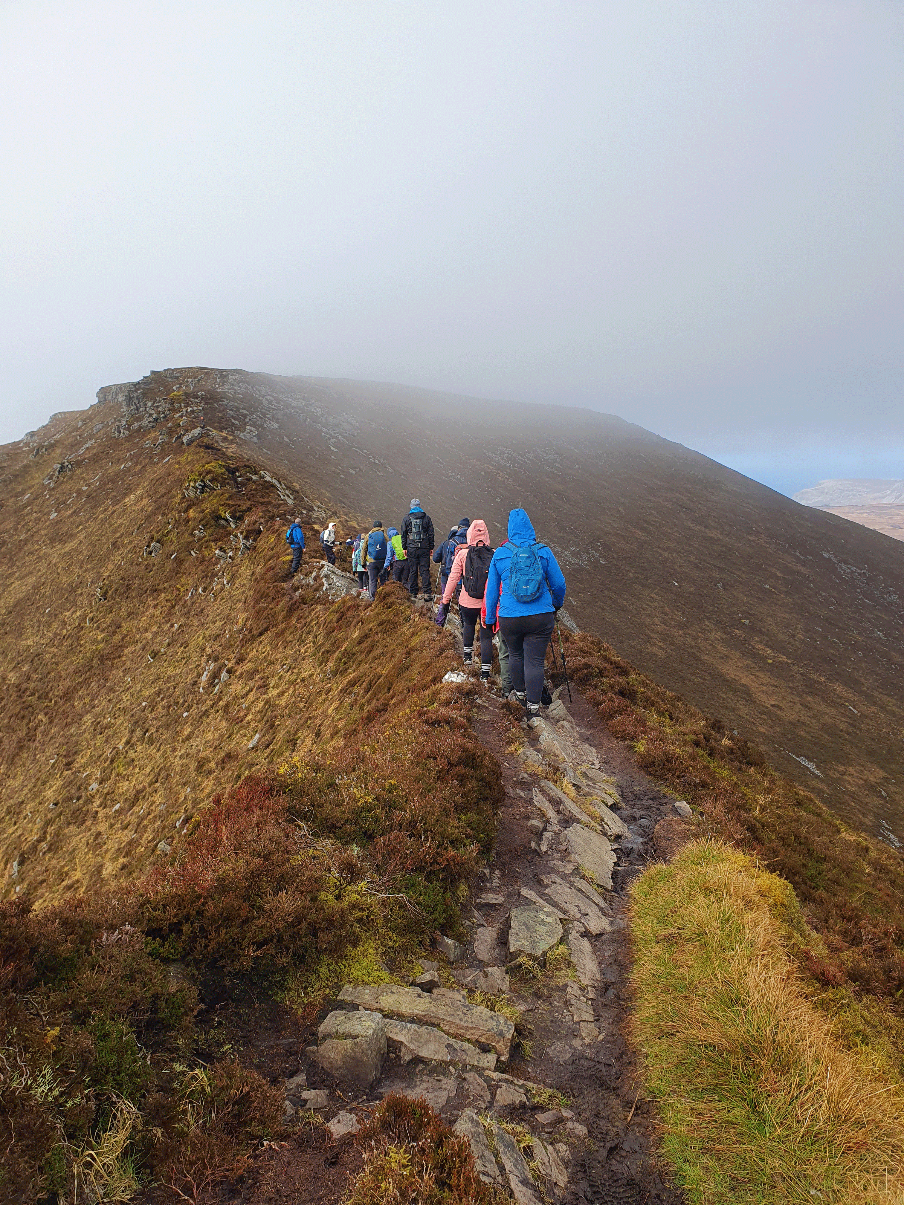 We meet at the Slieve League Visitors Centre at the allotted time (just round the corner from The Rusty Mackerel Pub and Teelin Pier). Its a pleasant 1 hour 20 minute drive from Black Pig Lodge. I must admit, the weather had that heavy moody look about it though, and I was glad of my extra layers and rainproof coat. A minibus ferried us from the Visitor's Centre to the start of the walk (Bunglass Point just before the Sliabh Liag Viewing Platform).