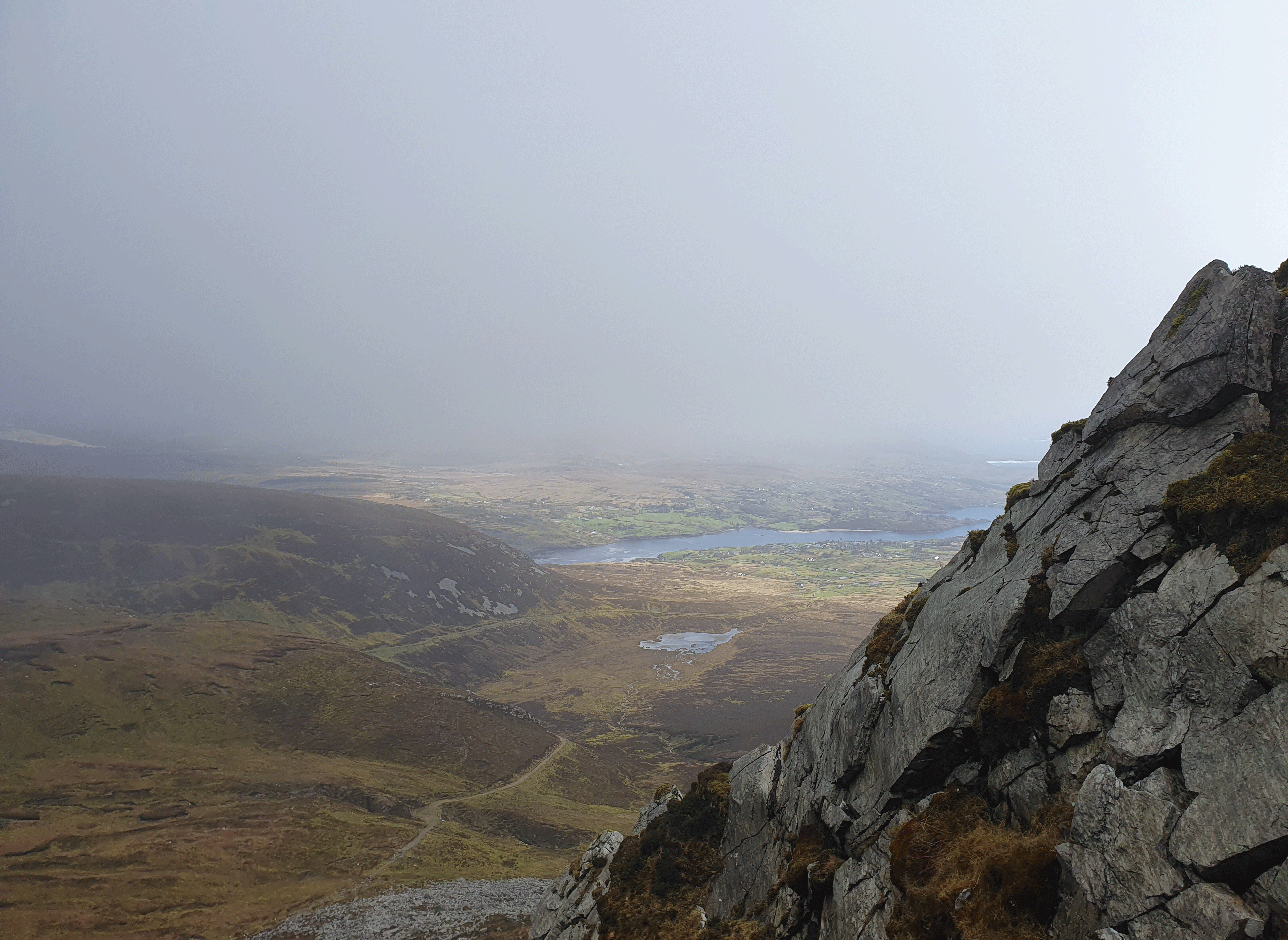 We reach One Man's Pass, aptly named because of its narrow path. The terrain drops away each side. On one side is Donegal Bay, on the other, the vast lowland landscape of southern Donegal.
